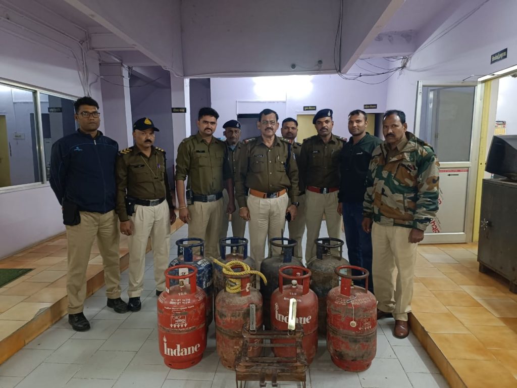 कर्मशियल गैस सिलेण्डर में घरेलू गैस सिलेण्डर से अवैध रूप से गैस रिफ्लिंग करते आरोपी गिरफ्तार, 4 कमर्शियल एवं 4 घरेलू गैस सिलेण्डर, 2 तौल कांटे, 1 नोजल जप्त
