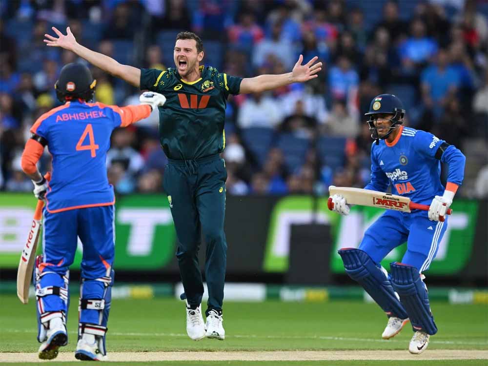 फिर हेजलवुड ने ऑफ स्टंप के बाहर फुल लेंथ की गेंद फेंकी तो मिड ऑफ पर खड़े मिचेल मार्श ने भारतीय उप कप्तान का आसान कैच लपक लिया। एलिस ने संजू सैमसन (02) को पगबाधा आउट किया। सैमसन ने डीआरएस रिव्यू लिया लेकिन यह बेकार चला गया। इसके बाद हेजलवुड की गेंद पर कप्तान सूर्यकुमार विकेटकीपर जोश इंग्लिस को कैच थमाकर पवेलियन लौट गए। दो गेंद बाद तिलक वर्मा भी हेजलवुड का शिकार हुए।